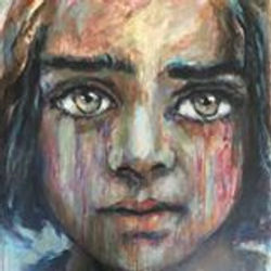 Sur des visages d'enfants, de femmes et de vieillards, personnages vulnérables au milieu du chaos ambiant, l'artiste peintre montre la palette des émotions que procure l'insupportable.
